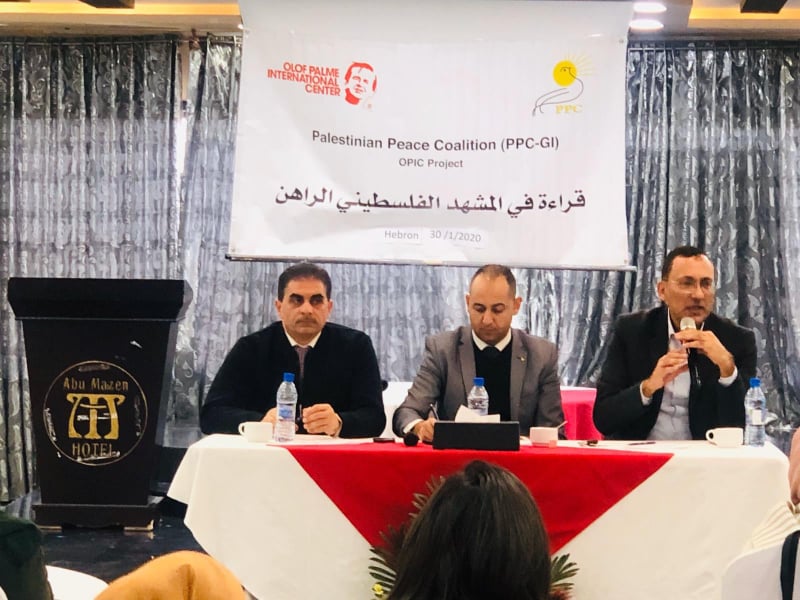 اختتم تحالف السلام الفلسطيني مؤتمر بعنوان "قراءات في المشهد السياسي الفلسطيني" في الخليل نهاية الأسبوع. و بحضور كل من سفير منظمة التعاون الإسلامي د. احمد الرويضي، ومساعد محافظ محافظة الخليل د. رفيق الجعبري، حيث شارك أكثر من 80 مشارك ونخبة من قيادات العمل الوطني والاجتماعي والقياديات النسوية، وعدد من رؤساء وأعضاء الجمعيات الفلسطينية بالخليل، إضافة إلى ممثلينت من مؤسسات رسمية ومجتمعية ونقابية وشبابية. قدم الدكتور أحمد الرويضي شرحا مفصلا عن صفقة القرن وما جاء فيها من حدود للقدس حالياً ومستقبلياً ببنود الصفقة ، و أهمية إنهاء الانقسام وتعزيز المصالحة و أهمية دور النخبة الفلسطينية في إحداث التغيير والتحديات التي تواجه المجتمع الفلسطيني، والحلول التي من شأنها أن توضح الأسس العلمية والفكرية الوطنية، بحيث تساهم في تنمية النهضة الشمولية والوصول بالواقع الفلسطيني نحو الأفضل.
